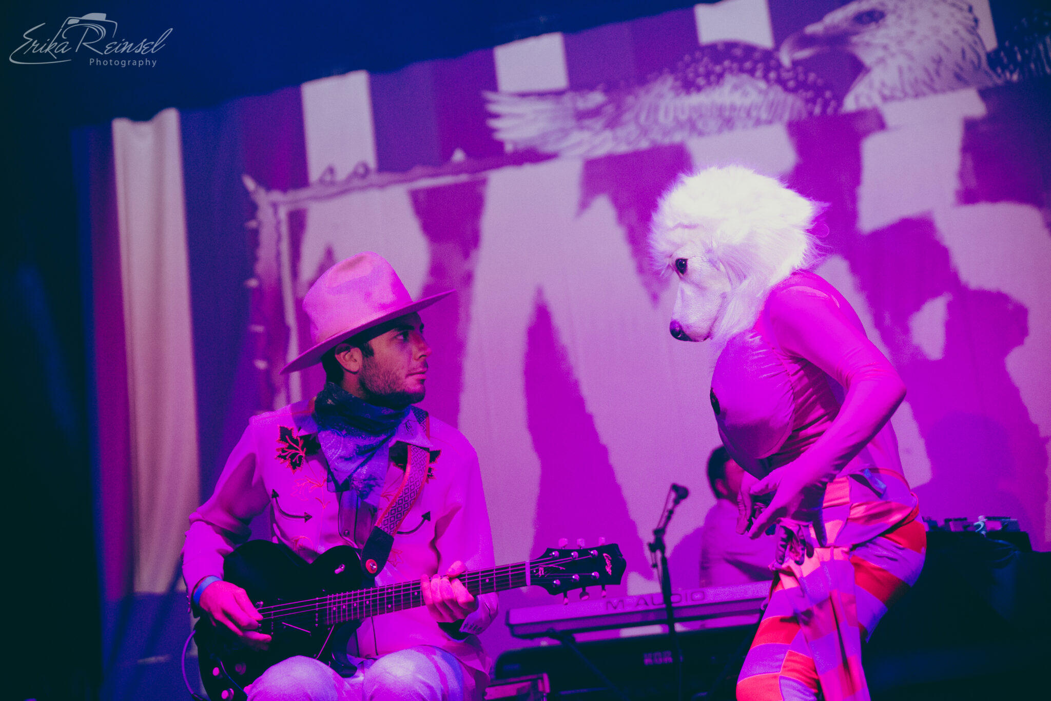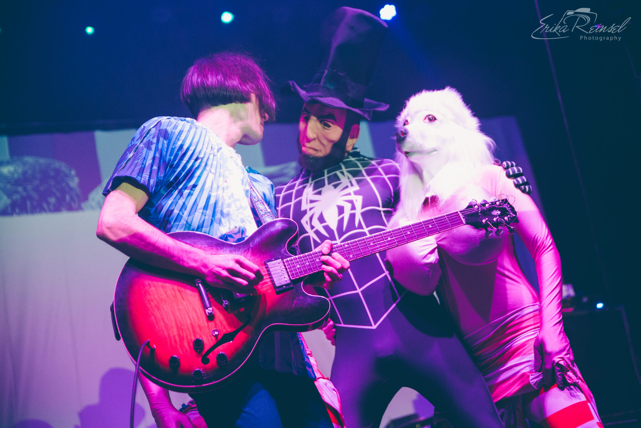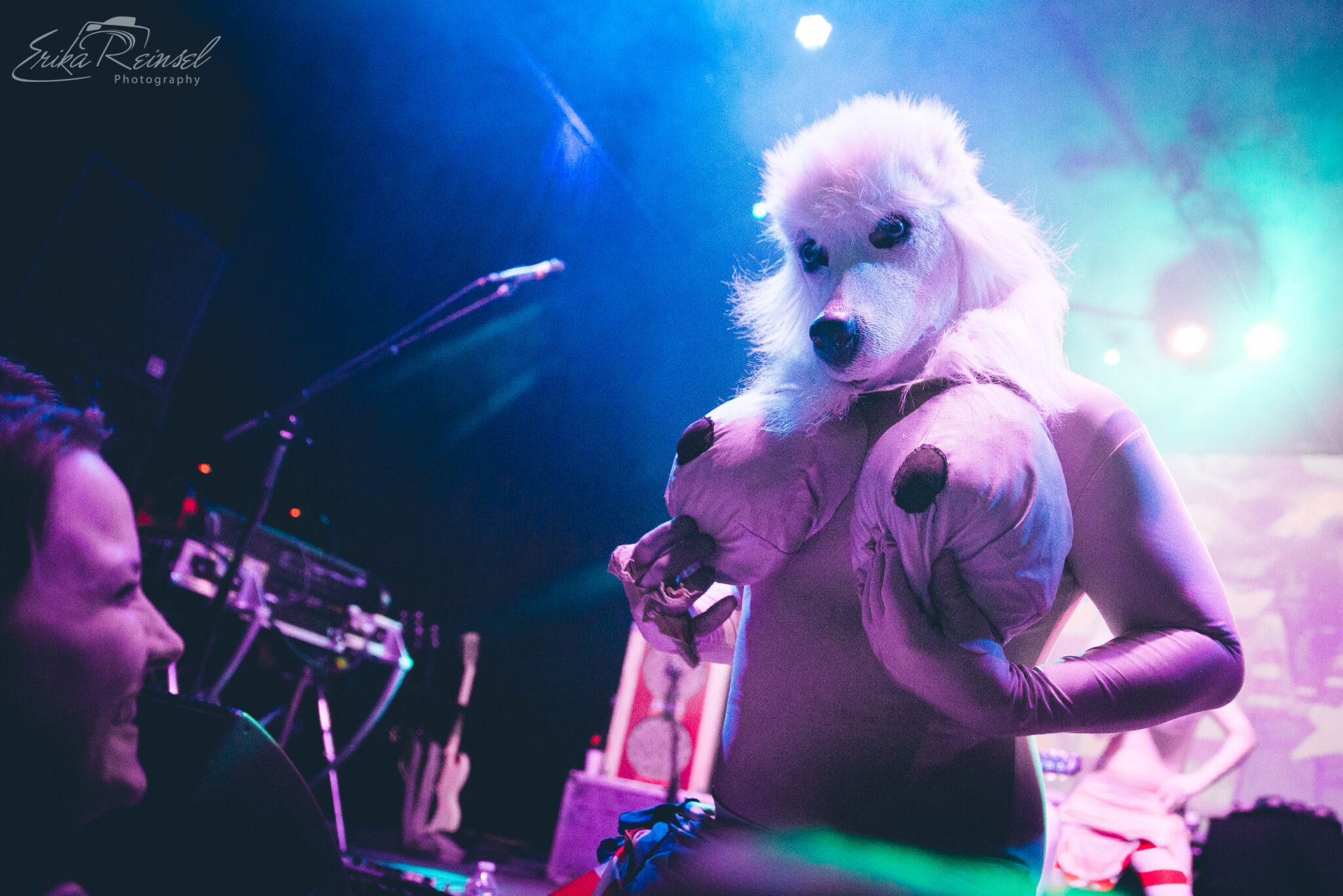 As much as the night was about the music, it was almost outshined by a number of spectacles including masked angels with overbearing wings, gas-masked dancers in onesies, a wedding party, two poodle-wolf-like creatures boxing in American flag tights, and an Abraham Lincoln Spiderman. More notably were the poodles sensually removing their clothes to expose massive inflatable boobs.