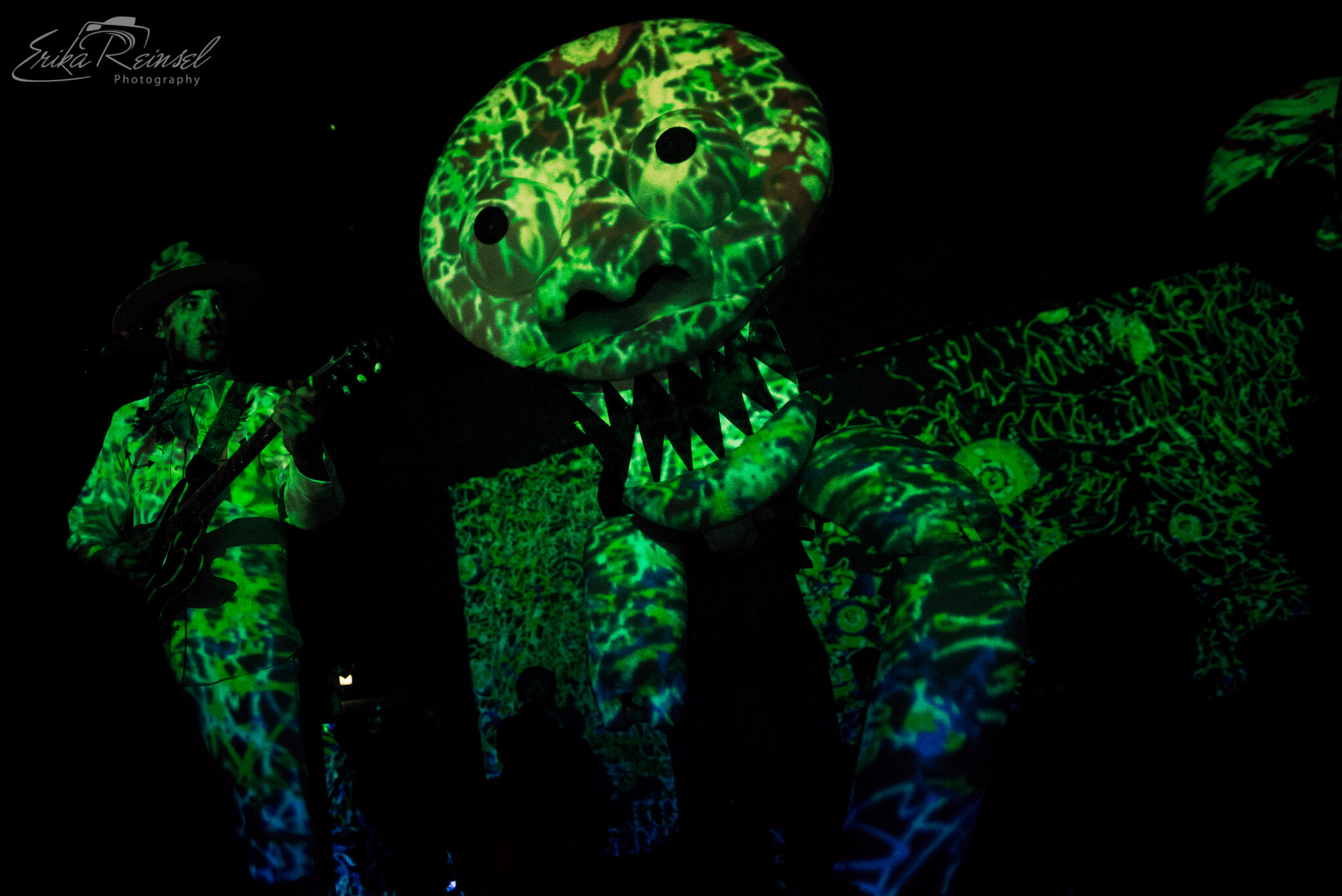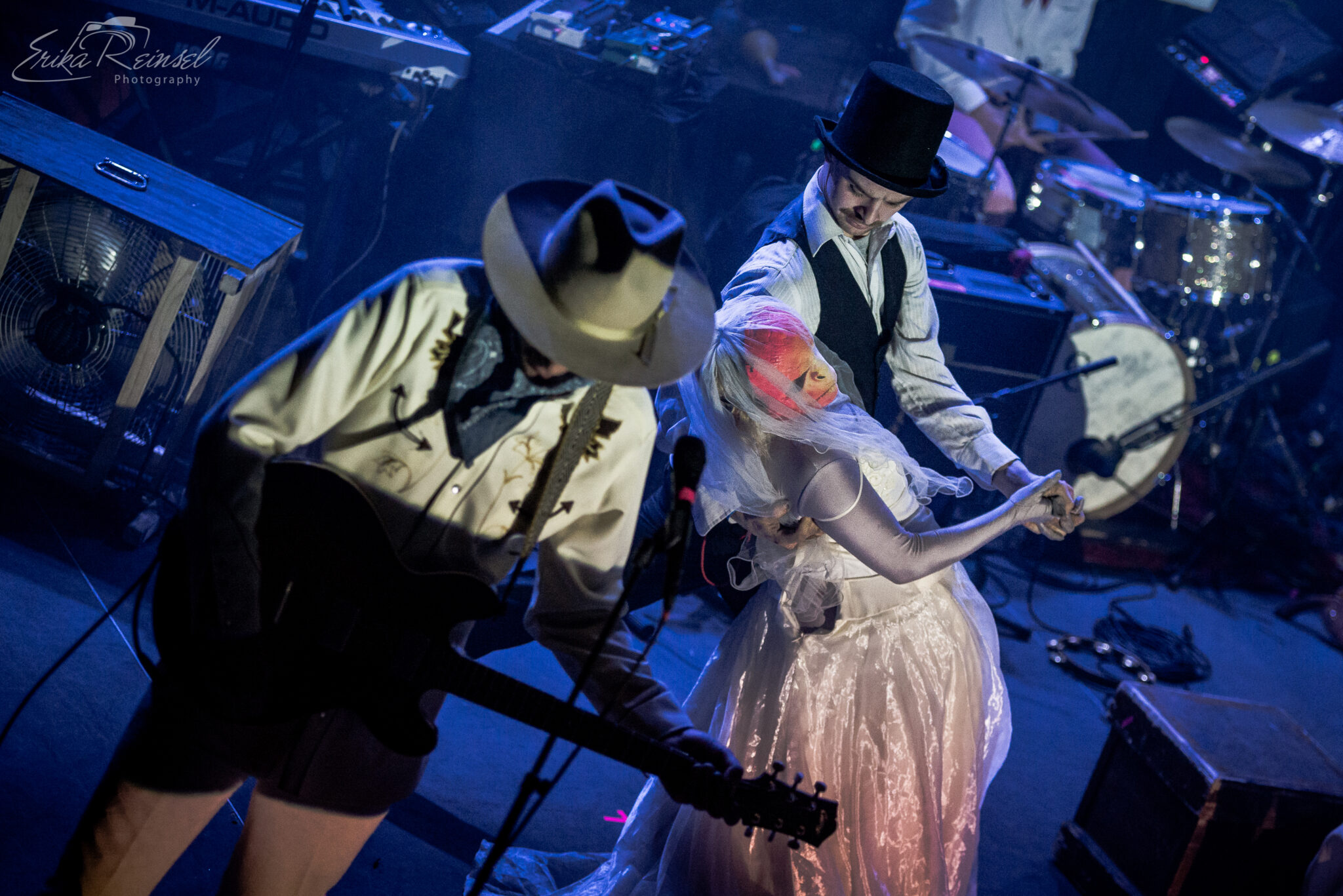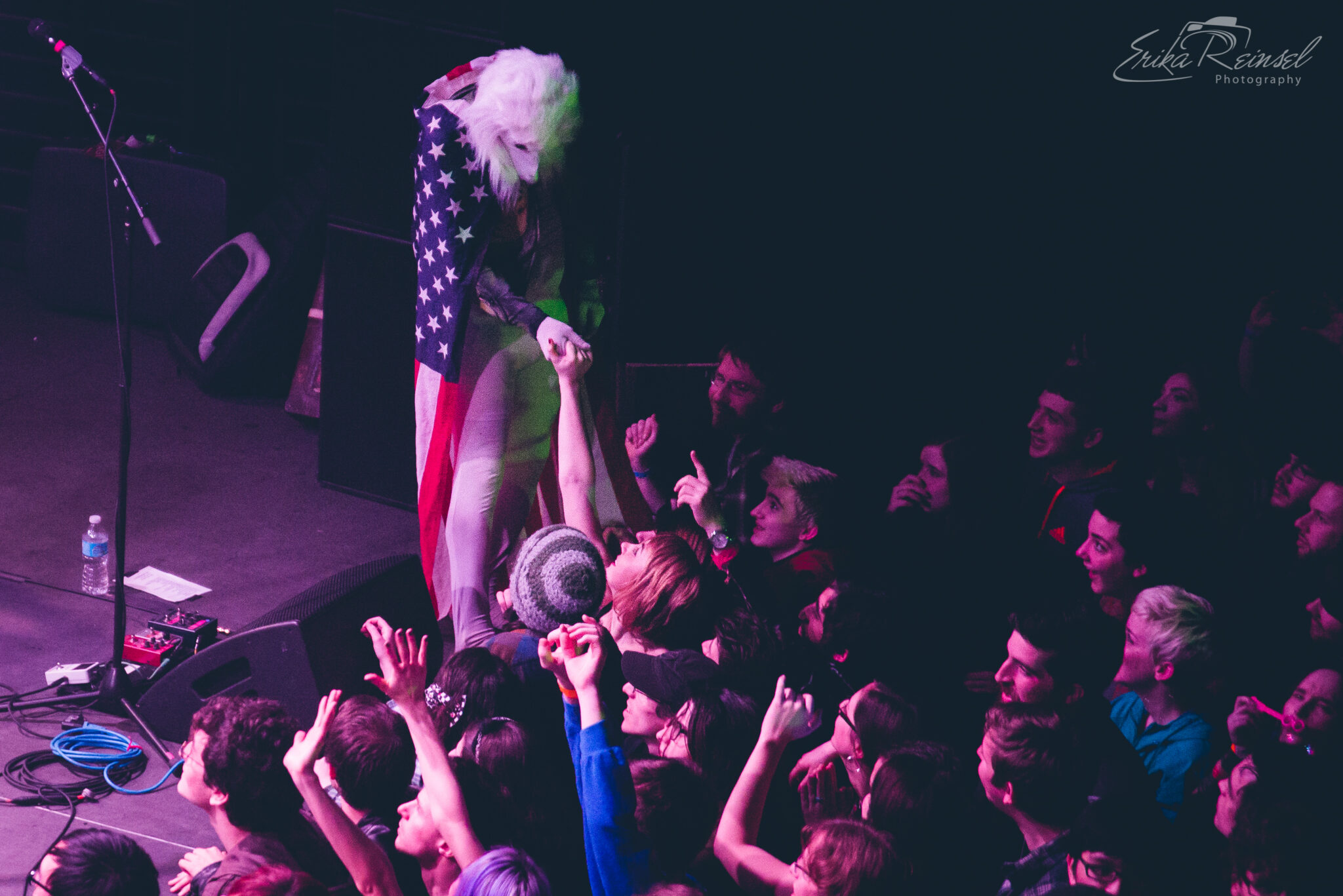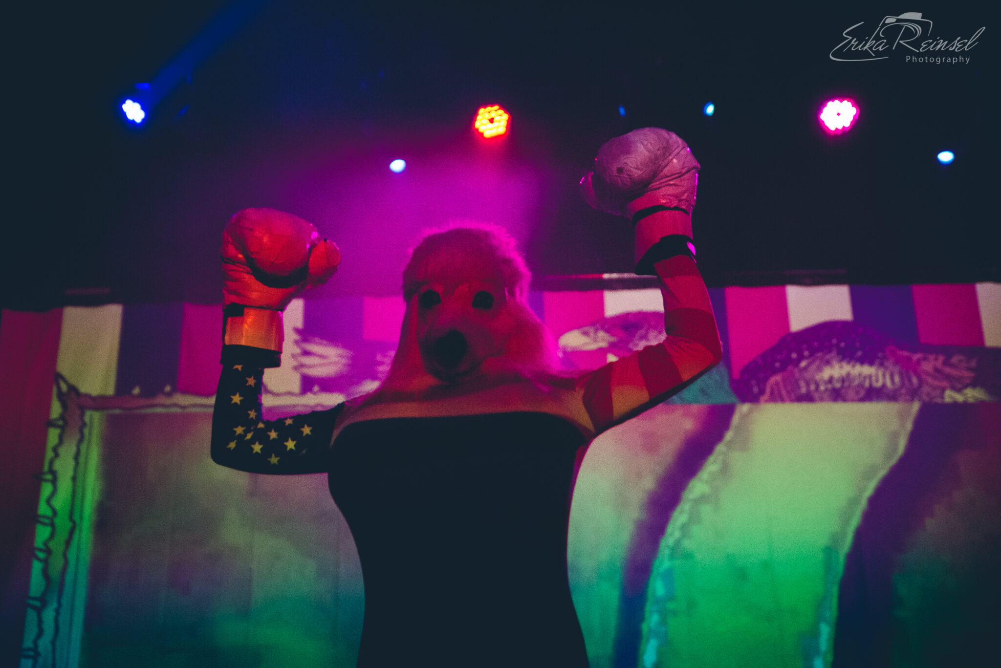 As much as the night was about the music, it was almost outshined by a number of spectacles including masked angels with overbearing wings, gas-masked dancers in onesies, a wedding party, two poodle-wolf-like creatures boxing in American flag tights, and an Abraham Lincoln Spiderman. More notably were the poodles sensually removing their clothes to expose massive inflatable boobs.
